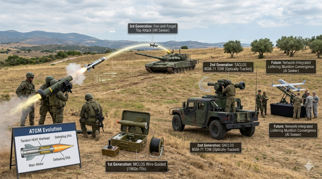 This guide traces the complete technological and doctrinal lineage of the ATGM: from World War II shaped-charge breakthroughs, through three distinct guidance generations, into the engineering physics of warhead defeat mechanisms and seeker electronics, and forward to the AI-enabled, network-integrated systems now in development.