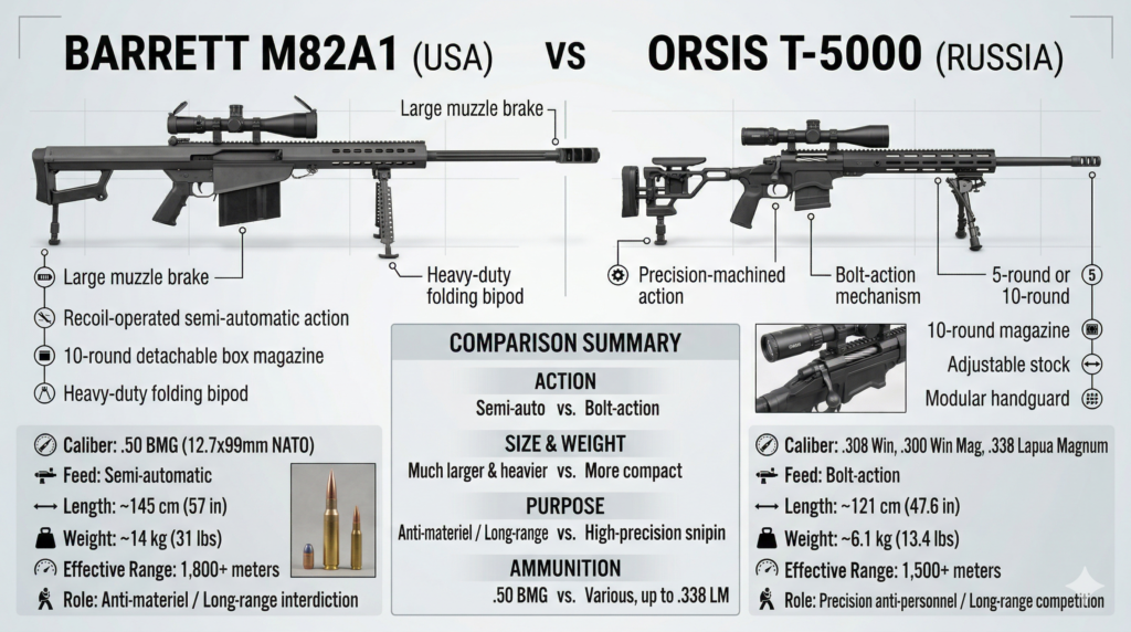 The rifles fielded by each nation’s snipers are not mere tools. They are physical expressions of the doctrinal philosophy that produced them. As illustrated above showing the Barrett M82 alongside the ORSIS T-5000, the contrast between American and Russian precision rifle design tells the story of two different answers to the same question: what must a sniper rifle do?